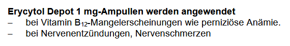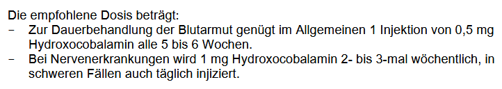 Veel mensen hebben de afgelopen jaren ervaren dat hun neurologische klachten geweldig toenamen nadat zij -min of meer gedwongen- moesten overstappen van B12 injecties naar tabletten. Ten tijde van professor Biemond waren orale B12 preparaten niet beschikbaar, anders dan in de vorm van rauwe lever. Nu koop je een potje B12 tabletjes bij een drogist, maar er is geen enkel bewijs dat bij mensen met neurologische klachten, orale B12 suppletie even goed helpt als intramusculaire injecties. De observaties van Biemond waren heel duidelijk, lees maar wat hij schrijft over de behandeling: voor adequate behandeling van mensen met neurologische klachten zijn veel hogere doseringen van B12 nodig dan voor de behandeling van de bloedarmoede! En dit komt bijvoorbeeld terug in de bijsluiter van goed gedocumenteerde B12-preparaten. De volgende afbeelding is een deel van de tekst van de bijsluiter van Erycytol, een injecteerbaar vitamine B12 preparaat dat op de markt is in o.a. Oostenrijk.