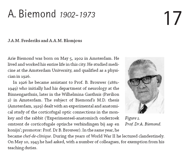 Amsterdam kende vroeger een eminent hoogleraar Neurologie, professor Arie Biemond (1902-1973), van wie uitstekende kennis, brede klinische ervaring, grote voorkomendheid en enthousiasme de belangrijkste kenmerken waren. Dit kunnen we teruglezen in een uitgebreide beschrijving van zijn persoon en klinische werk, geschreven door twee van zijn voormalige assistenten, dr. Frederiks en Blomjous (https://www.neurologie.nl/wp-content/uploads/2022/01/History-of-Neurology-in-the-Netherlands-hoofdstuk-17-blz-283-290.pdf). Dit blog is mede een eerbetoon aan de klinische kennis die professor Biemond had ontwikkeld over de desastreuze gevolgen van vitamine B12 tekort voor het zenuwstelsel.