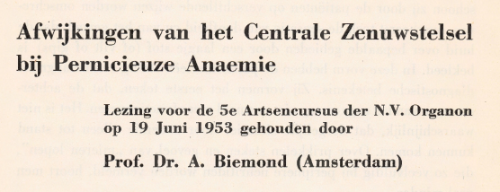 Ik was nog lang niet geboren, toen professor Biemond in 1953 een uitstekende lezing gaf over de afwijkingen van het centrale zenuwstelsel bij pernicieuze anemie. De lezing is nog terug te vinden in één van de uitgaven van de serie Het Hormoon, een serie die jarenlang is uitgegeven door de N.V. Organon, en zich wijdde aan alle aspecten van de klinische endocrinologie en stofwisselingsziekten. In de samenvatting van zijn lezing geeft hij een zeer goed leesbare en gedetailleerde beschrijving van de neurologische afwijkingen bij pernicieuze anemie en vitamine B12 tekort. De beschrijvingen zijn zo precies en welomschreven, dat je je afvraagt waarom deze kennis zo in het slop is geraakt de afgelopen decennia.
