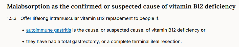 Also, stopping B12 injections in a person with demonstrated pernicious anaemia and B12 malabsorption is not the best advice, to say it politely. In pernicious anaemia, there is a very high risk of worsening or recurrence of symptoms when B12 injections are stopped, and even when people are forced to switch to oral supplementation. This is why the NICE guidelines are very explicit: lifelong intramuscular vitamin B12 therapy !