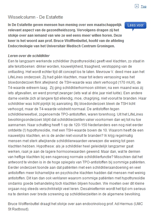 Mw. T. zat er doorheen, zij kon weinig meer; moeite met concentreren, vermoeidheid, kouwelijk, en dan die pijn in haar hals, irritant. De schildklierfunctie bleek afwijkend, dus als zij maar medicijnen ging slikken dan zou zij zich herboren voelen, zo werd haar verteld. Bij onderzoek had deze dame een duidelijk vergrote, enigszins pijnlijke schildklier. Het bloedonderzoek liet een verhoogde TSH waarde zien (8 mU/l), de vrijT4 was normaal. De spiegel in het bloed van antistoffen tegen de schildklier was knallend hoog. Het overige bloedonderzoek toonde geen bijzonderheden.