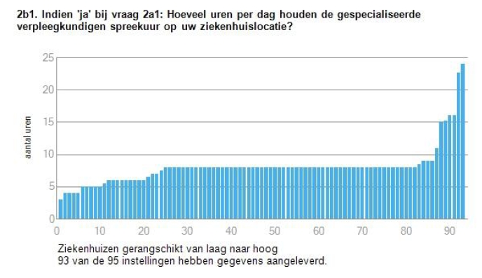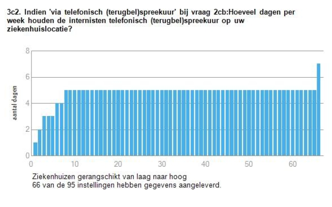 Nog een leuke? Een andere vraag was ‘Hoe veel dagen van de week houden de internisten telefonisch terugbelspreekuur?’ Er is één ziekenhuis waarop de internist je zelfs op zondag terugbelt. Dat geeft het begrip marktwerking in de zorg een geheel nieuwe inhoud. Of zou dit het zelfde ziekenhuis zijn dat over nachtsuikerzusters beschikt?